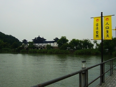 三个小时后,我们到达了据说是游览太湖的绝佳处——鼋头渚。放眼望去,太湖烟波浩渺,小岛星罗棋布,但近看岸边,还是有蓝藻如油漆般漂在水面上,散发出淡淡的臭味。太湖是我国的三大淡水湖之一,还有美丽的传说,说是王母娘娘的装七十二颗珍珠的盒子掉下人间变成的。这本来是很好的意境,但是眼前的景象确实有点让人倒胃口,唯一可取的是岸边有荷塘、小桥和轩榭,景色还不错。