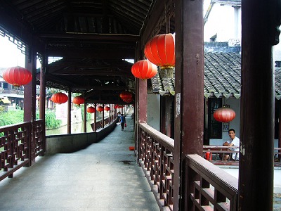 我们沿着石板路,经过莲池禅院,就真正地进入锦溪,小桥流水人家的景色真实地展现在我们眼前。锦溪水巷四通八达,蜿蜒穿越整个镇子。隔三差五就能遇上石拱桥,它宽不过三米,桥上游人如梭,桥下乌篷穿行。乌篷船里的游客任由船妇摇着橹,在水巷穿梭,自己悠然自得地欣赏着水乡风景。间或有的船妇收了游客的小费,不顾自己五音不全,扯起嗓门来上几句流行歌曲,博得了阵阵笑声。水巷两边大都有长廊,根本不用担心日晒雨淋。老人悠闲地坐在长廊内或下棋或纳凉,友好地点头向我们打招呼。长廊边上就是民居,白墙黛瓦,木门木窗,古朴不失高雅。沿途旅店、手工艺作坊、酒肆、茶馆一家接着一家。茶馆、酒肆的招牌挑出长廊外,醒目惹眼。虽然水乡里早通了自来水,但是常年生活在水巷里的老人还是习惯在水巷里洗衣洗菜。越往深处,巷子显得更狭窄,民居更集中密集。在锦溪多见连片的民房,而难得见到单门独户的楼房,我猜测水乡地少是一大原因吧。