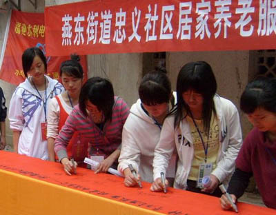 忠义社区于2010年3月20日上午,在居家养老服务站健身广场隆重举行居家养老志愿者结对服务签约仪式。出席签约仪式的有燕东街道党工委、民政局社区办领导及参加签约仪式的福建水利电力职业技术学院青年志愿者、永安三中共青团志愿者和优抚老人100余人。