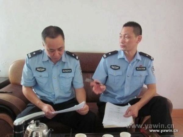 如图,罗长辉向贡川派出所教导员李志涛了解交通管理工作的热点、难点情况,将林区道路状况提供给他们,建议两所连锁入户宣传,共同搞好交通安全工作。