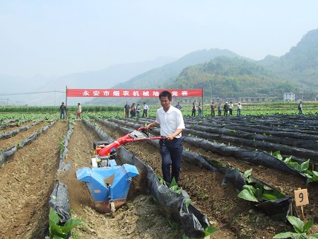 4月11日上午,永安市烟农机械培土竞赛在安砂镇石碧村举行,来自全市各乡镇选派的12位参赛机耕手云集在该镇石碧村的一片烟田里,参加烟叶机械培土竞赛,每个机手进行六垄烟地的培土操作,经过评委的现场计时与培土质量评定,有六位机手分获一、二、三等奖。其中,安砂镇茶子林村的机手王谋富以培土速度快、质量好拔得头筹,获得比赛第一名,另一名安砂镇机手获得三等奖。