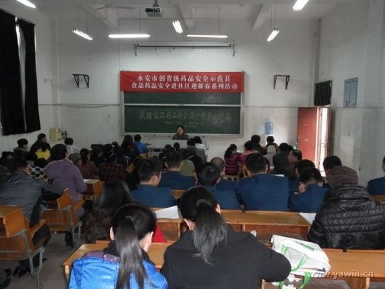 2012年1月12日下午,永安市药监局与忠义社区联合开展了主题为“食品药品安全进社区迎新春系列活动”,邀请了三明市药监局陈春平副局长作食品药品安全知识专题讲座,驻永安94789部队官兵、“三牵手”结对学生、家长、老同志,共100余人聆听讲座。