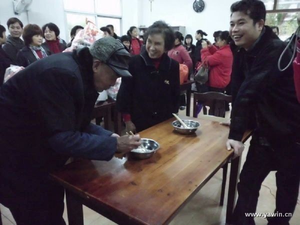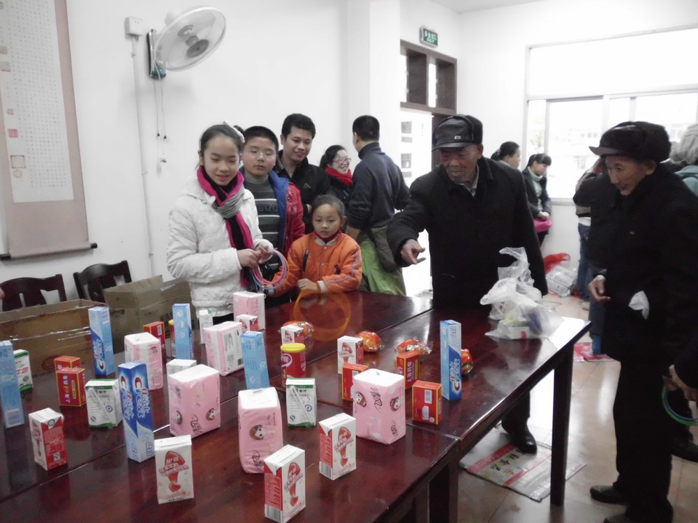 连日的阴雨天气没有挡住志愿者们奉献爱心的脚步。1月15日下午,来自社会各界的爱心人士相聚在永安市社会福利院,提前为院里的孤寡老人过大年。一到福利院,首先映入眼帘的是一条题写着“祝贺老年朋友们龙年吉祥,身体安康!——燕城爱心协会、老年大学贺”的充满喜庆的条幅。还没有到约定的时间,一批批爱心人士们就从四面八方赶了过来,一箱箱、一袋袋慰问品往福利院的食堂送,偌大的食堂此时顿显拥挤。活动开始后,福利院更是人头攒动、热闹非凡。志愿者们们首先给老人们带来了丰富多彩的文艺表演,志愿者的精彩表演博得了来自福利院及国德老年公寓的老人们的阵阵掌声。志愿者们共为老人们表演了大合唱《新年好》、《铃儿响叮当》、《爱的奉献》等节目,热闹的氛围挑起了一些志愿者的表演欲望,在没有准备的情况下,纷纷上台表演。观看完文艺表演后,老人们来到食堂,这里志愿者们为他们准备了套圈圈、飞镖、夹弹珠等游园活动。老人们积极参与到活动中来,游园活动不看重结果,只要参加活动都能够得到香皂、牙膏、牙刷等小礼品。老人们尽情地享受参与活动过程中的快乐,玩在其中,乐在其中。最后,福利院的老人们在志愿者们的搀扶下,坐在凳子上接受大家的拜年,志愿者们送上了准备好的新年礼包和小红包,每个老人都得到了3个新年大礼包和一个小红包,志愿者们祝福老人们龙年吉祥,身体安康。此外,志愿者们还为老人们送去了蛋、肉等年货。并为福利院贴上了窗花。据不完全统计,本次活动,爱心人士们共为老人们准备了价值2000多元的年货。福利院的老人们说“感谢社会爱心人士及老年大学志愿者们对我们的关爱!”