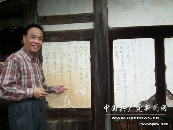 图为福建省党史研究室原副主任、研究员林强在石峰村瓦窑头厝解读北上抗日先遣队留下的红军标语(罗联久管其乾摄影)