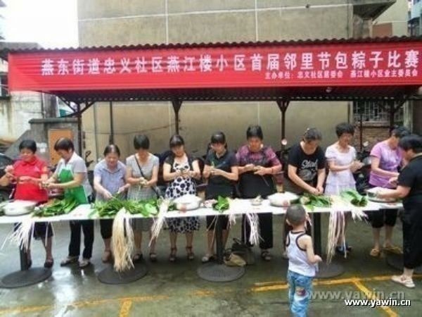6月17日上午,燕东街道忠义社区燕江楼小区业委会举办首届“邻里节”包粽子比赛等系列活动。活动内容有:一是由社区居委会主任范秀芳向燕江楼小区业委会授邻里恳谈室的牌子;二是由燕江楼小区业主们为首批好邻居评选投票,共选出3名好邻居楷模;三是按报名顺序分组进行现场包粽子比赛,比赛分每组5人,每组比赛时间15分钟,比赛将评选出一等奖1名、二等奖2名、三等奖3名,评选后还对获奖者发奖状及奖品。未获得名次的参赛者授予参与奖;四是活动券抽奖,设一等奖、二等奖、三等奖各1名,当场兑奖。