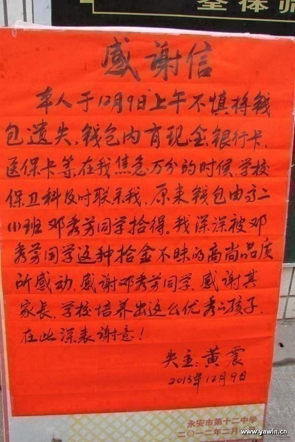 12月19日上午放学期间,永安十二中校门口宣传栏前围满了人群,大家都在观看上面的大红表扬信。信中表扬了该校高二(1)邓秀芳同学拾金不昧的事迹。邓秀芳同学在这天上学路上捡到黑色钱包,内有存折、医保卡、现金等,邓秀芳同学捡到手提包后在原地等待近1个多小时,在未等到失主认领的情况下,她返回学校将包交学校保卫给科。在学校保卫科老师的帮助下,最终联系到了失主——黄震先生。当黄震先生接过失而复得的钱包时,激动万分,为邓秀芳同学拾金不昧的精神深深感动。