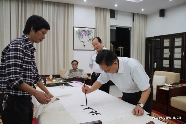 15、中央党史研究室原副主任、著名党史专家石仲泉(左)通过永安媒体记者、本文笔者将他为北上抗日宣言发布地石峰村题字转交给石峰村两委(赖晓斌 摄影)