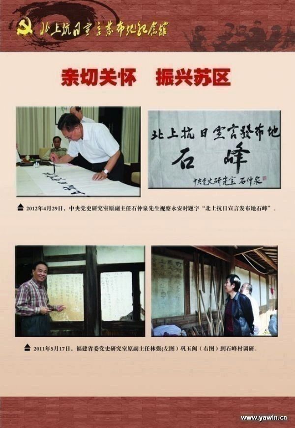 19、由永安市财政拨款10万元,并由永安市委党史研究室原主任张丽华把关建立的北上抗日宣言发布地石峰纪念馆南侧最后一间展室展板展示福建省委党史研究室原副主任龚玉闽(右一)、林强等考察石峰村,左上图为中央党史研究室原副主任石仲泉为石峰村题字(展板底稿)