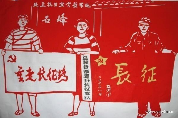 1、2016年9月22日,永安剪纸爱好者林元辉根据老红军后代、总装备部退休老兵田竞到北上抗日宣言发布地石峰村重走长征路的照片创作了《石峰村重走长征路》的剪纸作品(管其乾摄影)