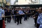 陈崇等民警和大地永隆物业劝导完群众打麻将走出楼栋。