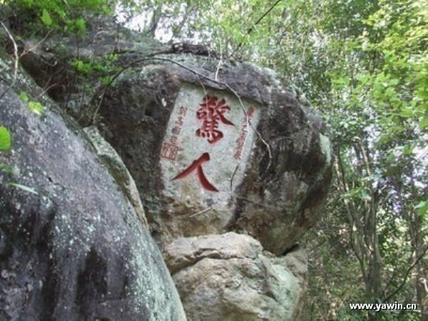 再往西上行经“更登”至“惊人”石刻(“惊人”、“吐碧”四字和那《十景诗》的序,均为清代吉山举人刘高恒(又名刘火索)题写的)。过了“云梯”,到志达古墓(清乾隆48年安葬的),上方刻有“天高气清”四个大字。