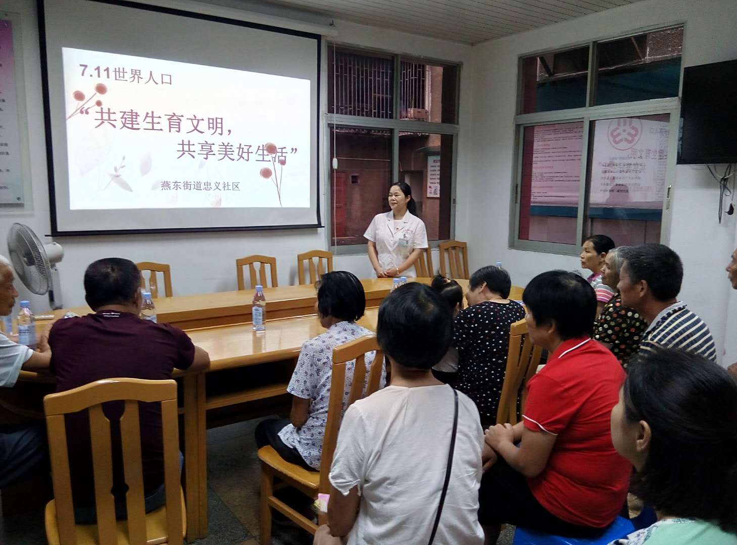 为纪念7.11世界人口日,结合我国世界人口日“共建生育文明,共享美好生活”的宣传活动主题,2018年7月11日,永安市妇幼保健院走进忠义社区开展婚检、孕前优生健康知识讲座,向大家宣传参加婚检、孕前优生健康检查的必要性,及国家为防治出生缺陷提供的惠民政策,如新增加的免费地贫筛查项目。旨在通过讲座进社区的方式,提高民众对婚检、优检等知识的了解,防止出生缺陷儿的发生,提高出生人口素质。社区居民约50余人参加讲座,发放各类宣传资料100余份。